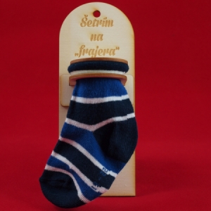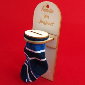 Drevená pokladnička. Rozmery 70x180 mm. Ponožka je pri každom kuse iná. Ak máte špeciálne prianie (zmena textu alebo požadovanú farbu ponožky), dopíšte to do poznámky v košíku.